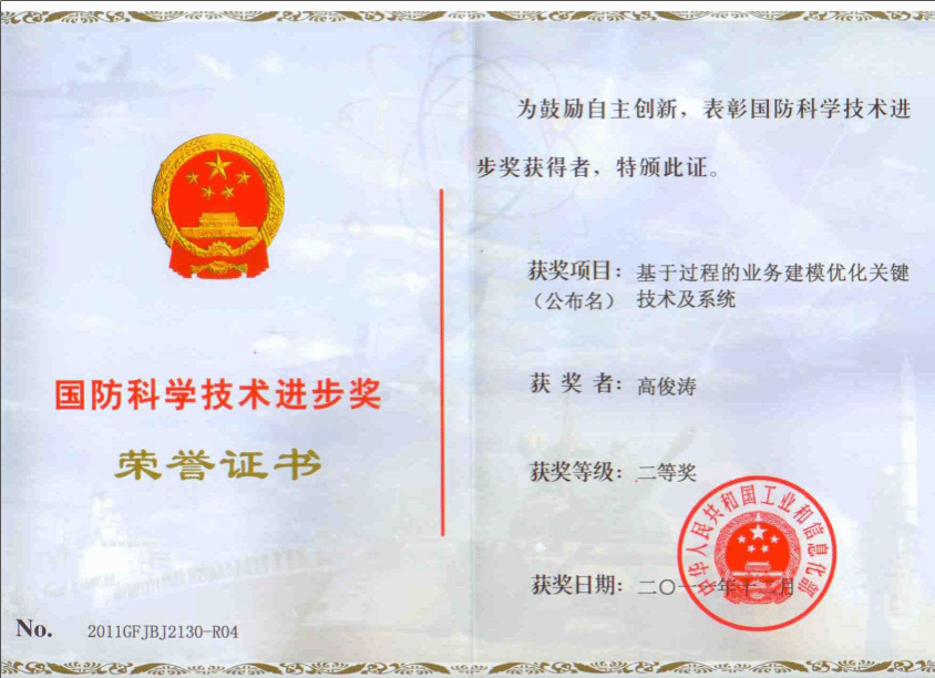 (1) 国防科学科技进步奖,二等奖,省部级,基于过程的业务建模优化关键技术及系统,高俊涛,2011年12月1日。