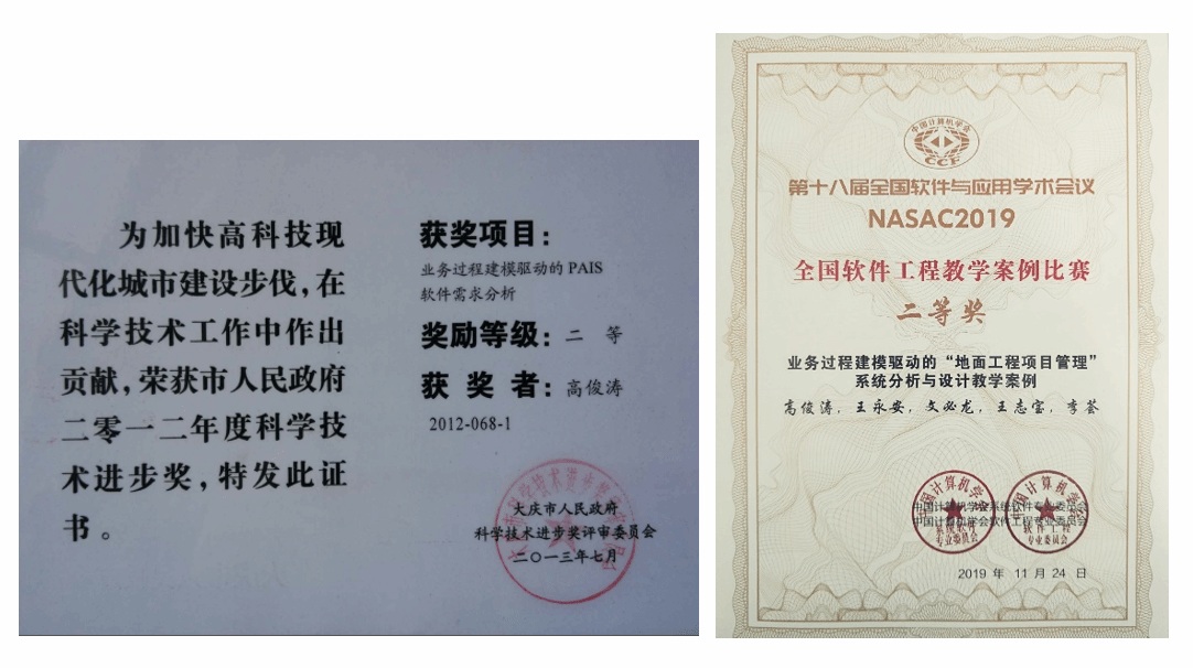 (2) 大庆市科技进步奖,二等奖,局级,业务过程建模驱动的PAIS软件需求分析,高俊涛,2013年7月1日。