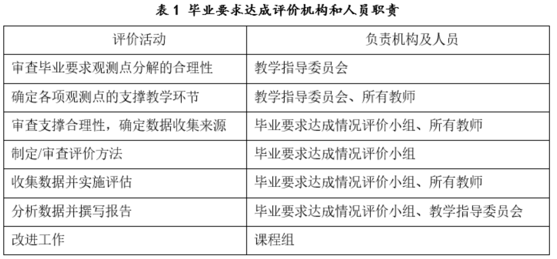 专业毕业要求达成评价由院、系两级专门机构实施。学院毕业要求达成评价机构由院教学指导委员会成员构成,负责审查毕业要求及其观测点分解的合理性,并与专业教师确定各项观测点的支撑教学活动,制定审核评价方法,由专业教师实施评估与收集数据。以系为单位成立了毕业要求达成情况评价小组,对毕业要求达成情况数据合理性进行分析,最终经教学指导委员会讨论确认毕业要求的达成情况。毕业要求达成情况评价机构和人员职责如表1所示。