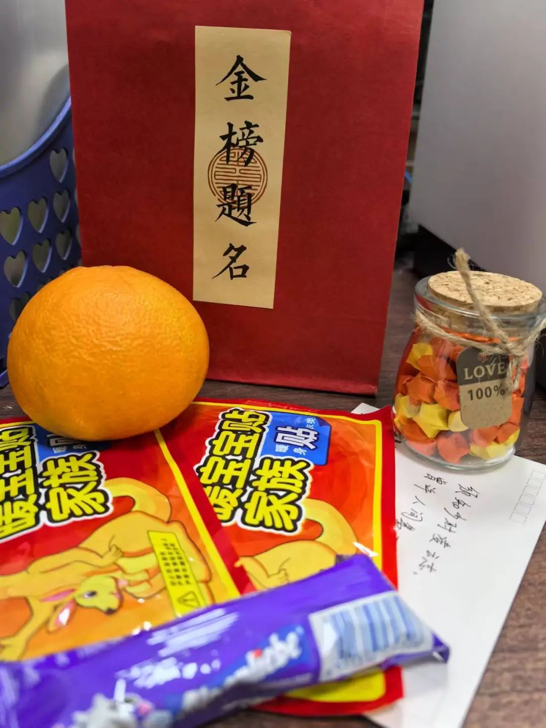 考研礼包中每一份礼物都代表了一份期待,寄托着学院对考研员工的关心与祝福;一颗硕大饱满的橙子,祝愿考研员工心想事“橙”;一个甜甜的棒棒糖祝愿考研员工取得优异成绩,金榜题名;两片暖宝宝,希望在寒冷的冬天也可以感受到来自学院的温暖;一张明信片,寄托着全院教师、学弟学妹们的共同祝福,愿考研学子能够”研“途漫漫,得偿所愿,一战成“硕”。